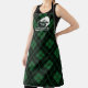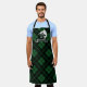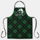 Apron printed with a green plaid pattern and a fish hook and leaping fish monogram featuring your name and initial in white.
