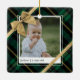 Elegant and festive special memory family photo multi-coloured green plaid faux fabric pattern ornament. Designed to resemble a Christmas present. We've decorated the ornament with a beautiful gold bow and ribbon. Single photo layout on each side of the ornament to display your special family photo or your kid's photo with custom caption on each side. Plaid design created by Moodthology Papery.