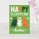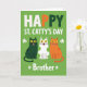 Designed with a lime green background, this St. Patrick’s Day card sets a festive scene with scattered white shamrocks and a cozy, friendly mood 💚. Near the top center, the text reads “HAPPY ST. CATTY’S DAY Brother,” stacked in a mix of white, deep emerald, and warm orange so the words stand out clearly. Below the message, three stylized cats sit close together like pals leaning in for a photo ☘️. On the left, a dark green cat with bright yellow eyes and a small pink smile looks calmly toward the group. On the right, an orange tabby with a striped tail mirrors that gentle, welcoming look, as if returning the same quiet affection. Between them, a white cat dotted with green polka dots opens its mouth in a happy meow, tying the trio together with a lively center point. The cats are drawn with simple, smooth outlines, and the yellow eyes pop against the flat green field while tiny shamrocks float around them.