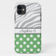 Custom iPhone 5 case personalised with your name, and designed with a green & white polka dot pattern and a faded zebra print pattern with grey & white zebra stripes.