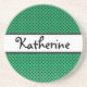 Add your own choice of name to the scalloped and polka dot ribbon stripe. Bright green background with black polka dots.