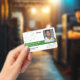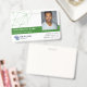 Horizontal employee ID badge personalised with logo, photo, name and title, and badge number and expiration date. Add name and title in white on green.