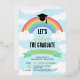 Fun rainbow themed graduation party invitation with a graduation cap-wearing rainbow, clouds and a blue sky with gold foil details.