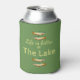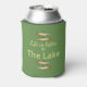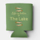 A whimsical can cooler designed with the text "Life is better @ The Lake" set in trendy yellow ink on a soothing shade of moss green. Two colourful trout images, one facing left, one facing right dress up the throw at the top and the bottom of the design. The design and the text is displayed on the front and the back of the can cooler.