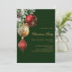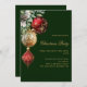 For a Christmas party with family and friends. A classic green background. Decorated with red and gold baubles and some greenery and a pine cone. Personalise and add the details.