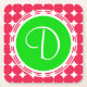 Red dots in close quarters create a secondary pattern of white stars. A large green circle is surrounded by white lines, while a single white initial graces the centre.