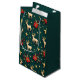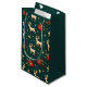 Elegant small Christmas gift bag in deep emerald green featuring a luxurious repeating pattern of golden reindeer, shimmering gold stars, and red gift boxes with holly accents. Perfect for sophisticated holiday wrapping. Ideal for jewelry, wine bottles, or small, special gifts. Great for traditional or upscale Christmas themes.