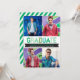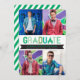 This is a double-sided design. The grad party invite details are on the back of the card on a plain black rectangle overlaying a simple striped pattern.