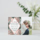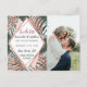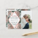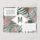 Pink, green, white, and faux printed rose gold summer, tropical, and elegant palm tree leaves on a plantation green background with geometric faux printed rose gold diamond cutouts, Save-the-Date wedding Postcards. This classic and sophisticated design is perfect for the trendy and stylish marrying couple. Personalise with your own message on the front as well as a customised monogram initial on the back. All photo print design.