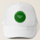 Business brand in green round shape on customisable trucker hat. Customise it by uploading your business logo, typing your business name, city or town and state. You can include it in your promotional products, giveaway items or gifts to your customers or clients, a marketing strategy to advertise your business or to promote your brand. Customisable trucker hat that you can use to build brand name awareness. Please check the appearance after uploading logo and typing text. If the appearance is pleasing to you, you can place your order now. If you need to resize or reposition the logo and text, please adjust in the design tool. You can also change the font style, font colour and apply background colour in the design tool.