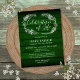 A rustic celebration of life remembrance invitation postcard featuring a hand-drawn foliage garland on a green wood panels background. Designed by Thisisnotme©