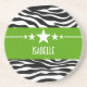 Trendy and modern Sassy Star Zebra Sandstone Coaster featuring a chic black and white zebra print background and a bold chartreuse green border adorned with a fun star motif. This girly design may be customised with the personalised text of your choosing. Click "Customise It" to find more personalisation options.
