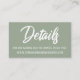 Keep your guests in the loop regarding all your wedding-related details with these pretty, comprehensive wedding favour insert cards. These pretty cards reflect an elegant, casual style. Elegant text overlays were designed using a modern, bold, casual script font; one side reads "Save the Date" and the other, simply says "Details". Use the template fields to customise these enclosure cards with your personal information. Printed using "business card technology" the handy size will be easy to keep on hand. Mail them with your traditional mailings, and keep a few around to share with those who need an extra or two! The background is covered in an elegant muted green and this editable colour can be changed to any hue from your wedding palette that you choose; all text is white. // 89 // Designed by Melody Watson for Paper Muserie.