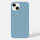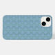This phone case has an art deco design of green half circles connect with lines on a field of blue.