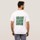 The "Green Scene Queen" t-shirt design features a vibrant abstract pattern in shades of green, yellow, and blue. The text "Green Scene Queen" is displayed in a playful and artistic style, with each letter having its own unique shape and colour. The design incorporates elements of nature, such as stylised leaves, flowers, and vines, creating a visually appealing and eco-friendly aesthetic.