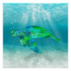 An endangered green sea turtle swimming underwater painted in ocean blues and greens with air bubbles floating towards the surface.