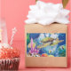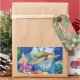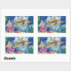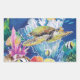 Silk painting of a green sea turtle and friends. Little gold fish, angel fish and others share the sea with colourful seaweeds and corals. Fun and bright for aquariums, gift shops, gifts and cards.