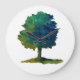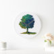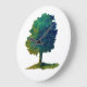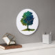 An earthy green shade tree in many shades, has grass growing under it, and is centered on the clock which has black hands to indicate time.