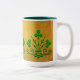 Vintage art of a three-leaved shamrock in Irish green with curly gothic elements along the bottom on a grungy faux parchment background.