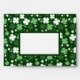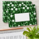 A whimsical shamrock print on a dark green background.