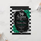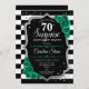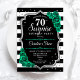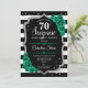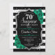 Surprise 70th Birthday Party Invitation. Feminine black, white and emerald green design with faux glitter silver. Features black and white stripes, roses, script font and confetti. Perfect for an elegant women's bday celebration. Can be personalized to show any age. Printed Zazzle invitations or instant download digital printable template.