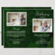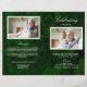 Funeral memorial program featuring on the front a photo of the deceased, thier name, dates, the memorial venue, date of the event, and elegant silver frame. On the inside is an obituary, and order of service; and on the back another photo, a thank you note and the second venue for after the funeral.