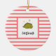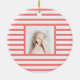 Elegant, modern and cute baby photo round ornament on pink stripe pattern. This template featuring an adorable illustration of Green baby dinosaur sleeping under the gold yellow stars with custom Baby's name. Great for both baby boy and girl. Perfect gift for all seasons!