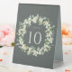 A dark grey green tented sign for wedding table numbers, featuring hand painted snowberries and eucalyptus arranged into a beautiful botanical wreath. All text is fully editable. Other designs, table number products and coordinating items are available in my store.
