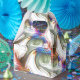 Stamped with digital spiral designs in a pale green with a soft metallic sheen tone and scratches in a grainy texture that when closely observed can be seen to be a graphic design with a rough effect and in some parts with a strong colour tone.