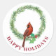 These sticker have a green background with red and white lines that form a pattern of squares. In the centre there's a white circle with an evergreen wreath and Cardinal.