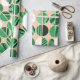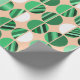 This wrapping paper mid-century modern design has oval halves, some solid and some striped, in green colours on a field of pale orange.
