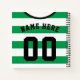 This design is an soccer (football) / rugby / sports style jersey with green horizontal hoops / stripes, the background colour can be changed, just click on 'CUSTOMIZE'.