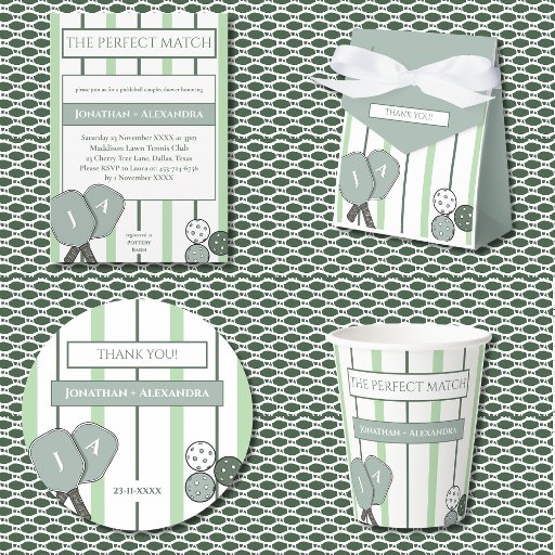 This "The Perfect Match" Couples Bridal Shower Pickleball Paddles design is a personalized, charming and stylish way to celebrate love, laughter, and a shared love of pickleball! The front of this design features the couples names and pickleball paddles with their monograms on it, surrounded by playful pickleballs in soft tones of green and white, all set against a chic mint, sage green and white stripes background finished with black trim for a beautifully elegant and modern look. The back features the couples monograms in a clean, modern typography font set against a sage green background, creating a personalised and cohesive finish that feels fun, polished, and timeless. With its fresh colour palette and sporty flair, this design perfectly captures the spirit of a pickleball match and the joy of a match made in heaven. Ideal for bridal showers, engagement parties, and wedding celebrations, this fun pickleball match theme adds a delightful personal touch to your pickleball paddles and a treasured keepsake—perfect for couples who love playful style with a modern twist. Celebrate love, laughter, and togetherness with a design that truly represents The Perfect Match.