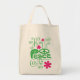 Tote bag with a green and pink design that includes the word, "peace", a peace sign, swirls, and flowers.