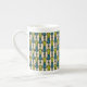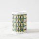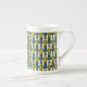 A stylish Bone China Coffee Mug, with a decorative 'tribal' pattern in Green and Teal, outlined in Black, on a Cream Background. Part of the Posh & Painterly "Jungle Drums" collection.
