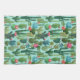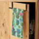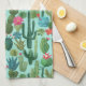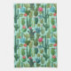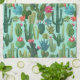 This is a pattern of decorative green and teal flowering cacti on a light teal background.