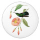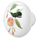 A bright green and blue hummingbird perches on a tropical vine with pink flowers.