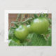 This beautiful postcard features a photograph of a pair of unripe green cherry tomatoes growing on a tomato plant in a suburban garden. The photograph was taken using macro photography for a detailed result.