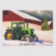 A farmer's favourite green tractor is parked in front of a red barn in the snow.