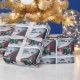 A farmer's favourite green tractor is parked in front of a red barn in the snow.