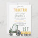Green Tractor Farm Boy 1st Birthday invitation. This cute "start your tractor and put it in gear" boy's 1st/first birthday party invitation features a Green tractor. Perfect for any age, and theme of the party, it is sure to impress your guests and get them excited for the celebration.