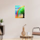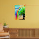 Poster in in a green, watercolor tree, against a blue sky and a vividly coloured rainbow