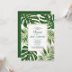 Tropical leaves green and gold wedding couple's shower invitation. It features leaves of Split Leaf Philodendron (Monstera deliciosa) or Swiss Cheese Plant and palm leaves in green with gold outline. Your wording is in a white frame with gold outline. The back includes a gold polka dot pattern.