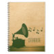 Quirky and unique Vintage Gramophone Notebook in dark green featuring a silhouette of an old-fashioned gramophone and a cascade of musical notes on a digital art rendered paper background. This chic custom notebook will keep your notes and thoughts together with vintage flair and is perfect for any music lover. Easy to customise, simply personalise with the text of your choosing. Click on the "Customise It" button to find additional personalisation options.