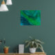 Waves of bright blue and green make up this translucent draped voile fabric print.