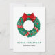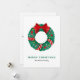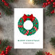 Share festive cheer with this charming Christmas greeting card featuring a green watercolor wreath tied with a red ribbon. Scattered around the wreath are candy canes, bright yellow and red circles, and silver stars, creating a playful and cozy holiday design perfect for sending warm Christmas wishes. GCard-005