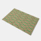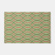 This doormat has a Boho design of green and orange waves on a field of light green.