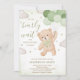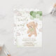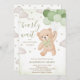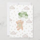Celebrate your little one with our Green We Can Bearly Wait Baby Shower Invitation, featuring an adorable brown bear with a green bow, holding green balloons. The background is beautifully adorned with soft clouds and twinkling stars, creating a dreamy atmosphere perfect for celebrating the upcoming arrival of your little one. BBS668