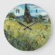 Green Wheat Field with Cypress. Vincent van Gogh. Cute summer landscape. There is a house on a green field. There is a tree growing next to the house. There is tall grass on the field. Clouds are running across the blue sky. Reproduction of famous works of art images in the public domain.