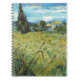 Green Wheat Field with Cypress. Vincent van Gogh. Cute summer landscape. There is a house on a green field. There is a tree growing next to the house. There is tall grass on the field. Clouds are running across the blue sky. Reproduction of famous works of art images in the public domain.